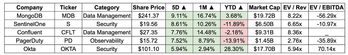 This week’s leader is MongoDB’s stock which grew +9% over the past 5 days, due to continued positive momentum following its recent strong quarterly earnings and upgraded guidance. As mentioned in a former edition, developers are less and less keen in using MongoDB and I believe we might see it reflected in the stock in the coming quarters.