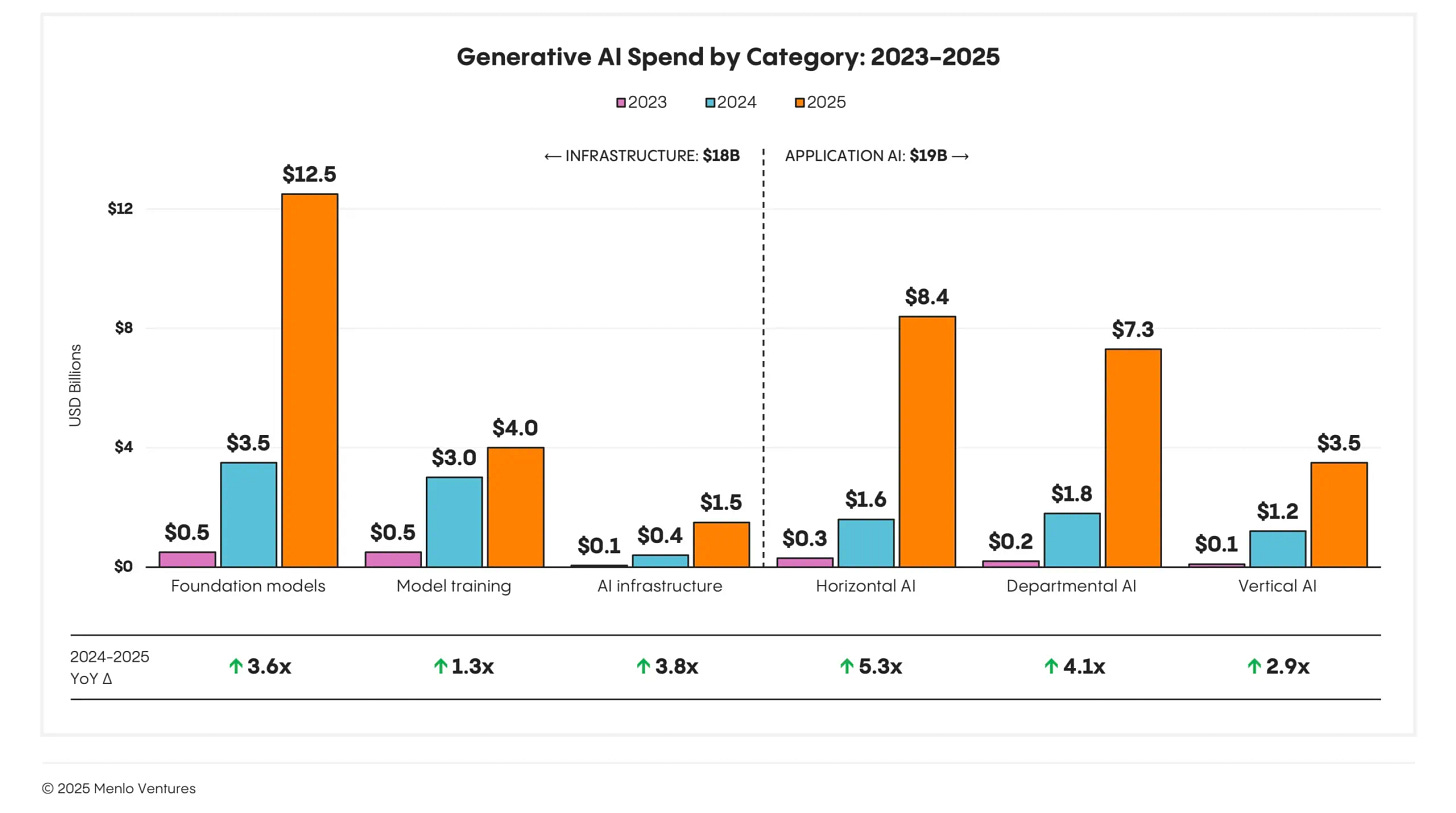The latest Menlo Ventures Enterprise GenAI Report confirms what many operators are now seeing on the ground: enterprise AI spending has fully crossed into scale. US companies spent $37B on AI in 2025, up 3× year over year. The biggest structural shift is where that money goes: 50% of spend is now at the application layer, a fourfold increase in just one year, as enterprises prioritise solutions that deliver immediate business outcomes over raw infrastructure or experimentation.