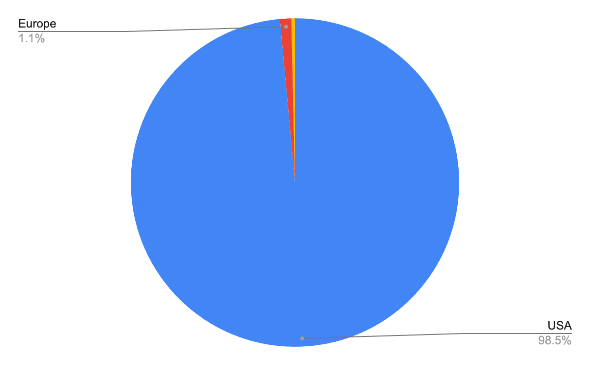 Europe-based companies attracted 1.1% of the total funding vs 0.4% for Asia-based companies (including Israël) and 98.5% for US-based companies.